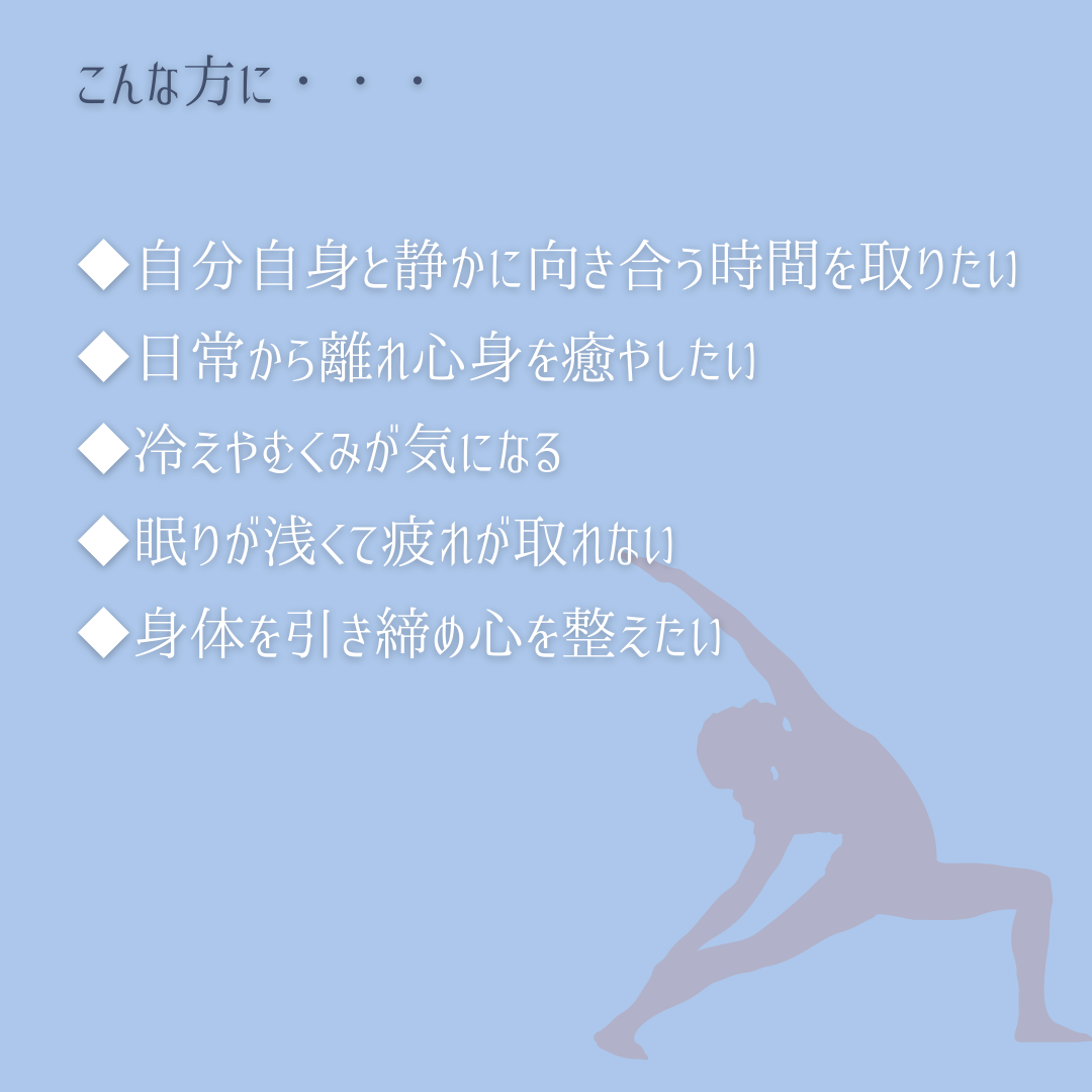 ■持ち物:動きやすい服装・バスタオル(あればヨガマット)・飲み物・汗ふきタオル